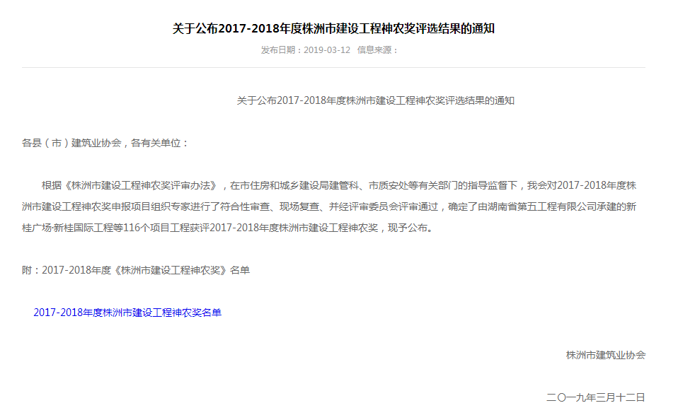 熱烈祝賀公司榮獲2017-2018年度株洲市建設工程神農獎!