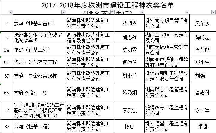 熱烈祝賀我公司承建的株洲湘火炬火花塞數字化陶瓷車間項目、華坤·時代建安工程項目、神驊·白金漢宮16棟工程項目、學府公館3、4棟工程項目、1.5萬噸高端電磁線生產基地項目辦公樓倒班宿舍食堂和1#聯合廠房工程項目,參建的晉合湘水灣一期花園洋房1-22#樓和新增地下車庫地基與基礎項目、晉合湘水灣三期高層住宅19-23、25號樓樁基工程項目榮獲2017-2018年度株洲市建設工程神農獎!